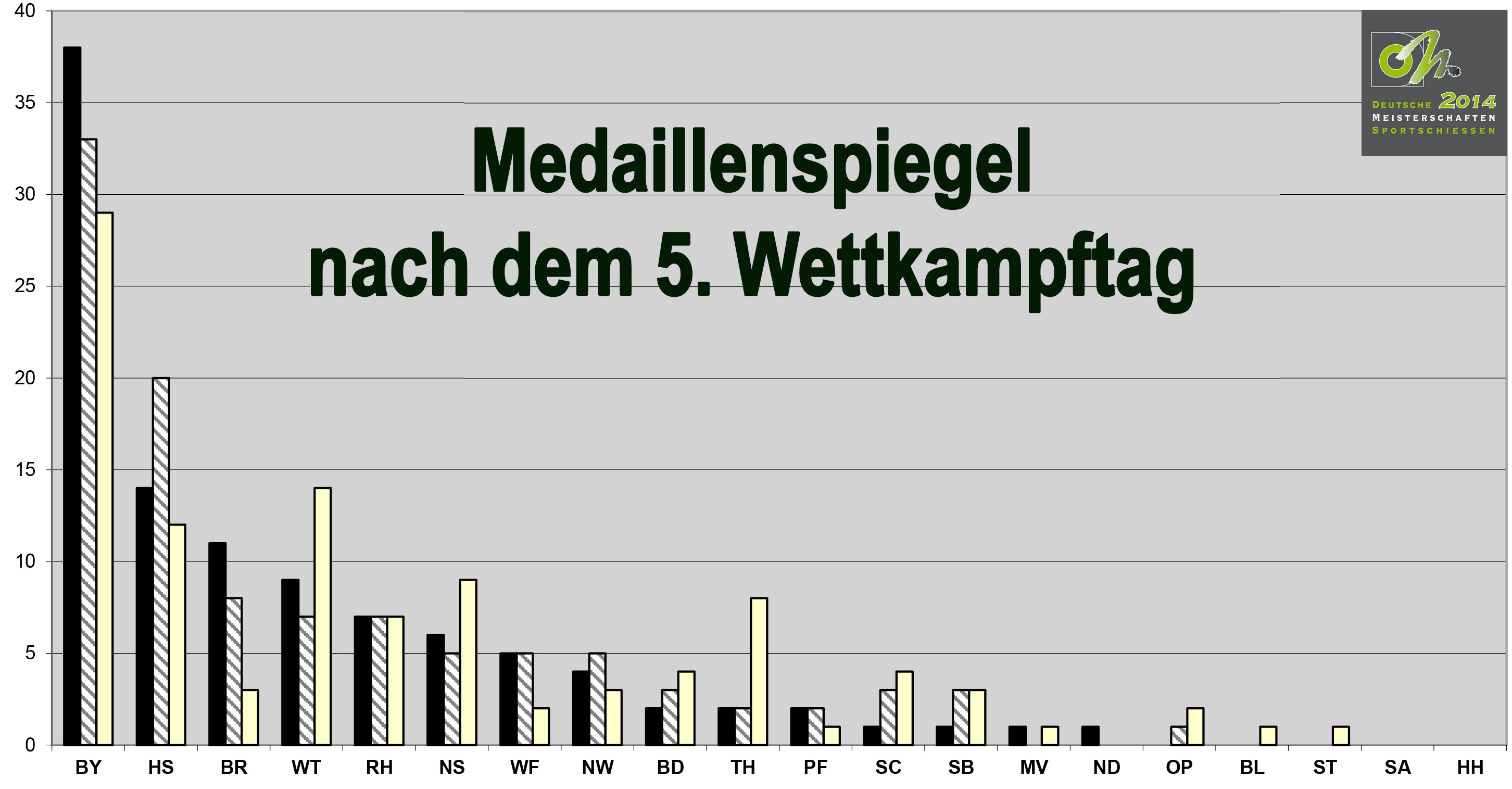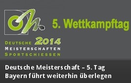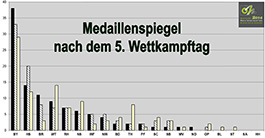 Die bayerischen Schützinnen und Schützen bauten am 5. Wettkampftag ihren Vorsprung im Medaillenspiegel weiter aus. Besonders erfolgreich waren die jungen Männer in der Disziplin KK 3x20, aber auch die Zimmerstutzenschützinnen und -schützen trugen Etliches zum Medaillenpiegel bei. (Zum Vergrößern der Grafik klicken Sie bitte auf das Bild)