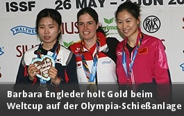 Barbara Engleder (Triftern) gewann souverän den Wettbewerb der Frauen mit dem Sportgewehr. Im hochkarätig besetzten Starterfeld – Athleten aus 89 Nationen nehmen am diesjährigen Weltcup auf der Olympia-Schießanlage teil – sicherte sich die Sportsoldatin mit 587 Vorkampfringen als Sechstplatzierte das Finalticket. In der Runde der besten Acht, setzte sie sich bereits mit dem ersten Schuss im Kniendanschlag an die Spitze des Klassements. Nach den drei Kniendserien hatte sich Barbara bereits einen Vorsprung von 2,3 Ringen erarbeitet, der nach den drei Liegend-Serien auf 4 Ringe angewachsen war. Trotz ener 7,8 beim letzten Schuss im Stehendanschlag gewann die junge Mutter mit 461,5 Finalringen und einem Vorsprung von 6,5 Ringen die Goldmedaille.