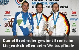Beim Weltcupfinale auf der Olympia-Schießanlage gewann Daniel Brodmeier (Niederlauterbach) Bronze im Liegendkampf mit dem Kleinkalibergewehr. Nach einem sehr guten Vorkampf mit 627,2 Ringen und einem äußerst spannenden Finale sicherte er sich Bronze hinter dem Goldmedaillen gewinner Henri Junghänel (Breuberg) und dem Slowenen Rajmond Debevec. Bereits am Vortag, im Wettbewerb mit der Freien Waffe, hatte Daniel Brodmeier seine Klasse bewiesen. Er verpasste mit Rang 4 nur knapp eine Medaille.