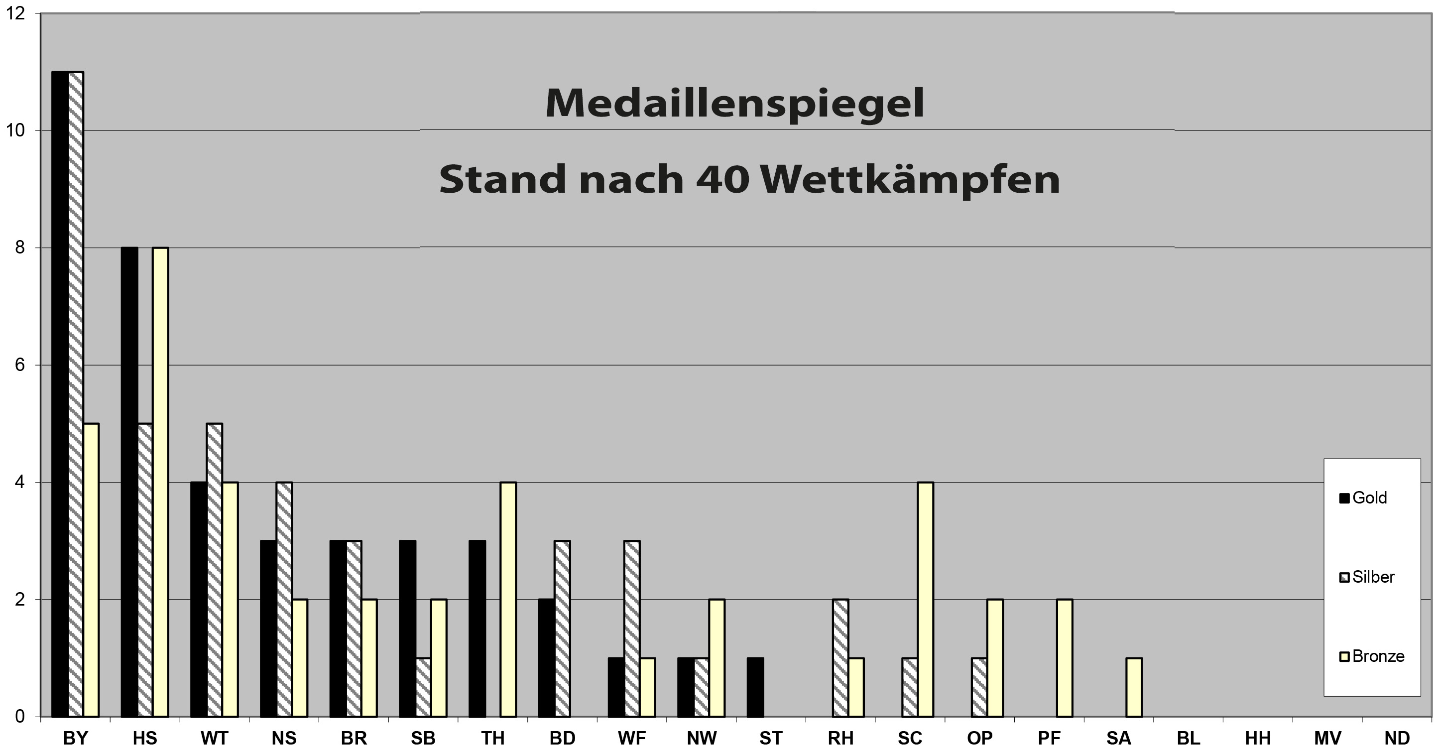Am zweiten Wettkampftag haben die bayerischen Schützen eine spektakuläre Aufholjagd gestartet und die gewohnte Spitze im Medaillenspiegel der DSB-Landesverbände übernommen. Dies ist um so bemerkenswerter, als auch die BSSB-Schützen momemtan den "olympischen Medaillenspiegel" anführen, in dem nur die Frauen- und Männerklassen, bzw. Junioren der olympischen Disziplinen gewertet werden. Ganze sieben Deutsche Meistertitel, fünf Silber- und drei Bronzemedaillen blieben heute im Freistaat.
