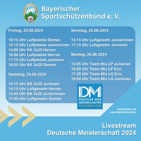 Knapp 6.000 Athleten kämpfen vom 23. August bis 1. September auf der Olympia-Schießanlage in Garching-Hochbrück um die Titel und Medaillen. Wie in den vergangenen Jahren gibt es die Entscheidungen am "olympischen Wochenende" (23. bis 26. August) aus der H&N-Finalhalle live auf den Bildschirm. So werden die Entscheidungen der Frauen, Männer, Juniorinnen und Junioren in den Druckluft-Disziplinen sowie im Dreistellungskampf mit dem KK-Gewehr auf sportdeutschland.tv zu sehen sein. Nach der Premiere im Vorjahr werden auch die Mixed-Teamwettbewerbe in den Druckluft-Disziplinen am Montag, 26. August, gestreamt. Das Livestream-Team hat zahlreiche Kameras im Einsatz, um die Livebilder zu produzieren. Als Kommentatoren stehen der BSSB-Sportdirektor Jan-Erik Aeply (Pistole) und Marco Hilger (Gewehr) zur Verfügung, nach den jeweiligen Finals gibt es – wie gewohnt – Interviews. Leider kann ein Stream von den Einzel-Entscheidungen in den Flinten-Disziplinen Trap und Skeet in diesem Jahr aus personellen Gründen nicht realisiert werden. Ein absoluter Höhepunkt findet am Donnerstag, 29. August, statt, wenn die Deutsche SchützenJugend ihren Shooty-Cup veranstaltet. Dieser besondere Wettkampf mit Nachwuchs- und Spitzenschützen wird ebenfalls live übertragen und von Marco Hilger mit Witz und Fachwissen kommentiert.