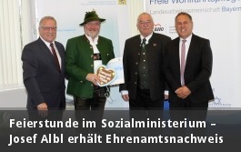 Im Rahmen einer kleinen Feierstunde im bayerischen Sozialministerium überreichte Staatssekretär Johannes Hintersberger die Ehrenamtsnachweis-Urkunde an den Traditionsreferenten des BSSB, Josef Albl (Oberammergau). Der Staatssekretär würdigte in seiner Laudatio Josef Albl als beispielgebende Persönlichkeit, die seit nunmehr 40 Jahren seinen unentgeltlichen Dienst der Gesellschaft zur Verfügung stelle. Das war auch der Grund dafür, weswegen Josef Albl in diesem Jahr stellvertretend für die bayerischen Schützenfunktionäre im Rahmen der Feierstunde ausgezeichnet wurde. Den Ehrenamtsnachweis kann nämlich jeder ehrenamtlich Tätige beantragen, der mindestens 14 Jahre alt ist und jährlich mindestens 80 Stunden (Schüler 60 Stunden) für sein Ehrenamt aufwendet.