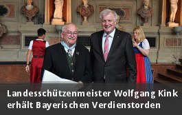 Im Rahmen einer Feierstunde in der Residenz zu München verlieh Ministerpräsident Horst Seehofer den Bayerischen Verdienstorden an unseren 1. Landesschützenmeister Wolfgang Kink. Der Verdienstorden wird „als Zeichen ehrender und dankbarer Anerkennung für hervorragende Verdienste um den Freistaat Bayern und das bayerische Volk" verliehen. Eine Besonderheit des Bayerischen Verdienstordens ist, dass die Zahl der lebenden Ordensträger auf 2.000 begrenzt ist.