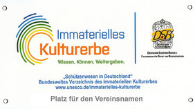 Werben Sie für Ihren Verein und unseren Sport mit der Auszeichnung „Immaterielles Kulturerbe" der Deutschen UNESCO-Kommission. Nutzen Sie das Logo des Immateriellen Kulturerbes auf Ihrem Vereinsbriefkopf oder zeigen Sie der Öffentlichkeit mit einem attraktiven Plexiglasschild, dass Ihr Schützenverein Teil dieses ausgezeichneten Deutschen Schützenwesens ist.
