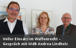 Am 30. September fand nun ein weiteres Gespräch mit der Vorsitzenden des Innenausschusses des Deutschen Bundestages, der unterfränkischen Bundestagsabgeordneten Andrea Lindholz, in Aschaffenburg statt. Der unterfränkische Bezirkssportleiter Volker Rühle und der im Landesschützenmeisteramt für das Waffenrecht zuständige stv. Landesschützenmeister Hans-Peter Gäbelein erläuterten der Ausschussvorsitzenden die derzeit dramatische Lage für unsere Sportschützen. Die Vertreter des BSSB’s machten klar, dass der vom Bundesrat beschlossene Entwurf keinesfalls Gesetz werden dürfe, da dies das sportliche Schießen auf lange Sicht praktisch zum Erliegen bringt und die Regelungen für viele Mitglieder nichts weniger als eine Enteignung bedeuten würde.